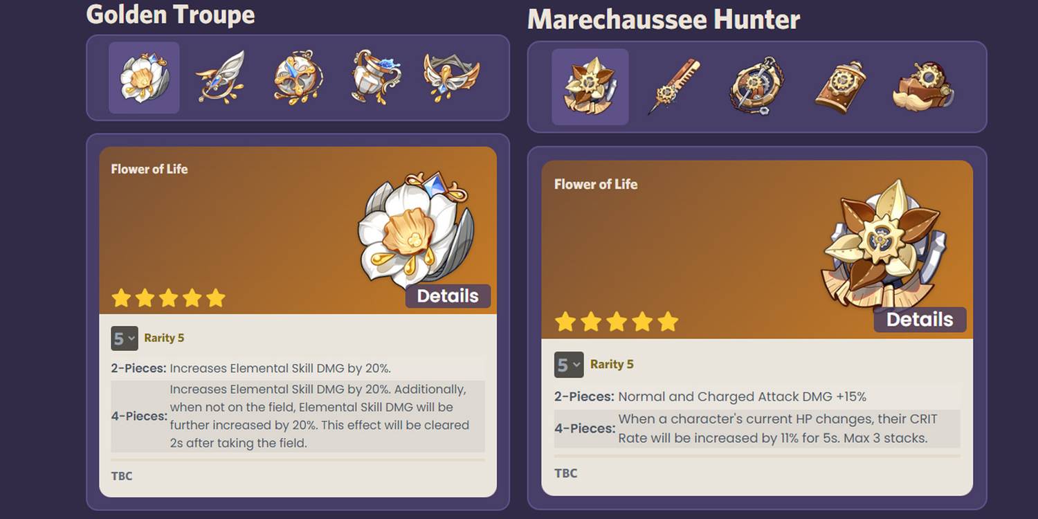 - Four-piece bonus: Provides an additional 20% damage buff on the character’s Elemental Skill. This effect can be further increased by 20% if the character is not on the field.